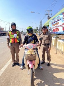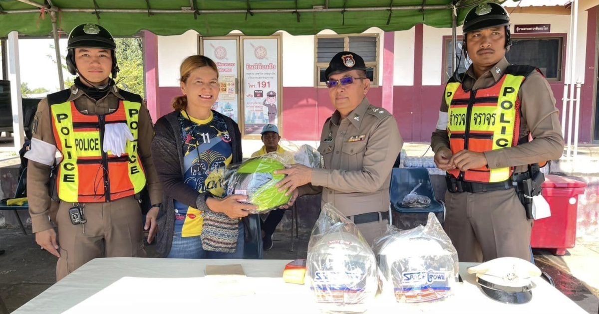3. จากนั้นได้แจกหมวกกันน็อค ให้แก่ผู้กระทำผิด ซึ่งได้รับความร่วมมือเป็นอย่างดี