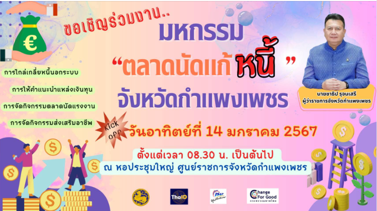 🗣️ขอเชิญร่วมงาน “ตลาดนัดแก้หนี้จังหวัดกำแพงเพชร” 📌ณ หอประชุมใหญ่ ศูนย์ราชการจังหวัดกำแพงเพชร